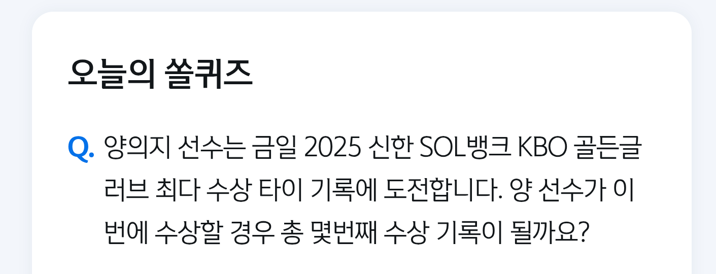 12/9 일 쏠퀴즈 쏠야구 퀴즈 #신한쏠 #sol #프로야구 #신한은행 #신한포인트 #신한카드 #신한금융그룹 #신한은행sol #쏠야구 #12월9일 #2025신한SOL뱅크 #2025신한프로야구적금 #2025신한프로야구정기예금 #예금 #우승팀예측 #마이신한포인트 #야구리그 #ox퀴즈 #프로야구적금 #신한야구적금 #신한프로야구적금 #KBO #2025년 #한국시리즈 #신한금융지주 #신한생명 #포스트시즌 #신한인증서 #야구 #스토브리그 #시범경기 #쏠픽 #위닝캘린더 #땡겨요 #올스타전 #월간MVP #가을야구 #포스트시즌 #퓨처스리그 #드래프트 #준플레이오프 #플레이오프 #신인 #mvp #골든글러브 #개막 #신한슈퍼sol #2025kbo개막