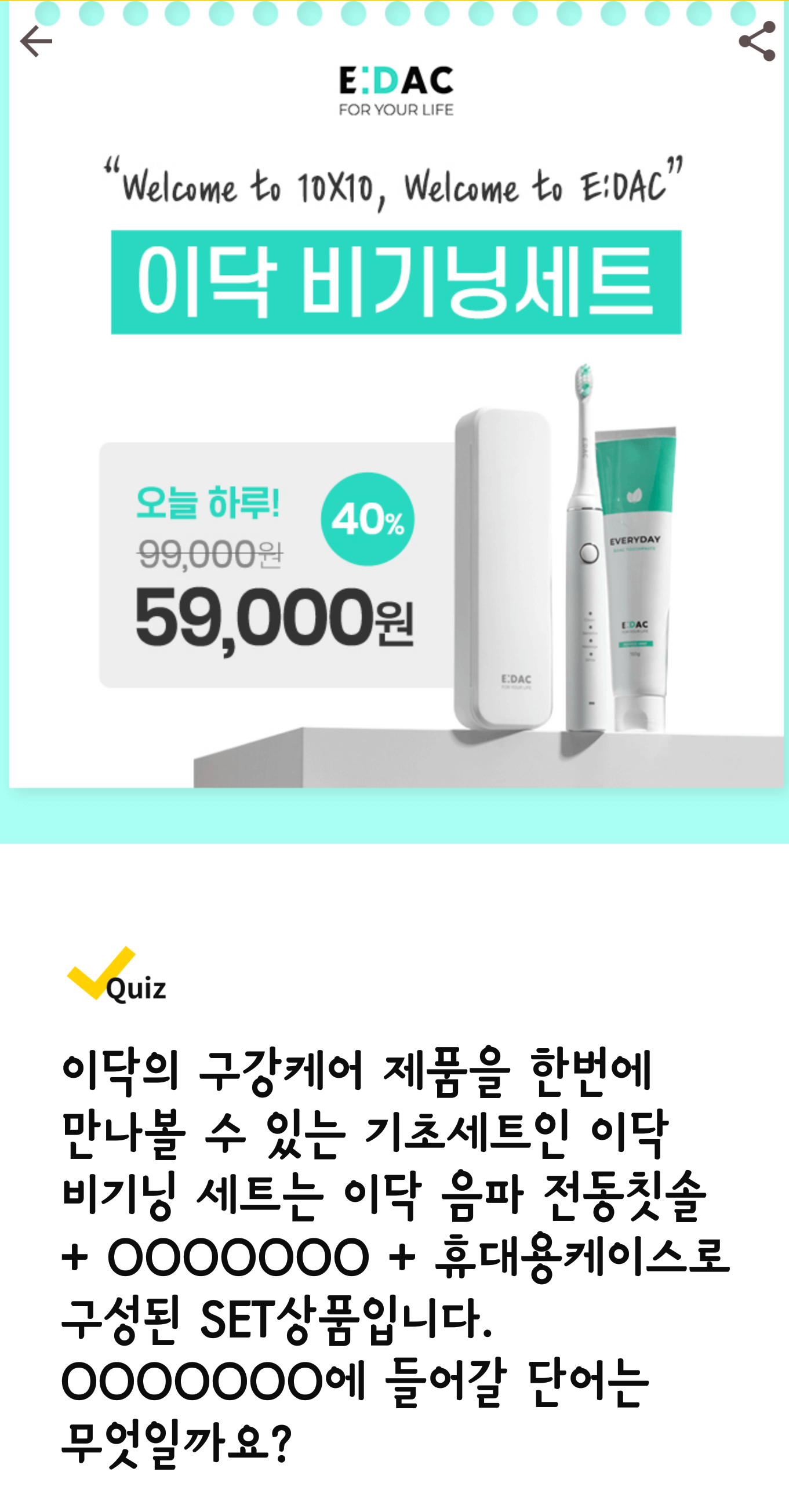 이닥의 구강케어 제품을 한번에 만나볼 수 있는 기초세트인 이닥 비기닝 세트는 이닥 음파 전동칫솔 + ○○○○○○○ + 휴대용케이스로 구성된 SET 상품입니다. ○○○○○○○에 들어갈 단어는 무엇일까요?